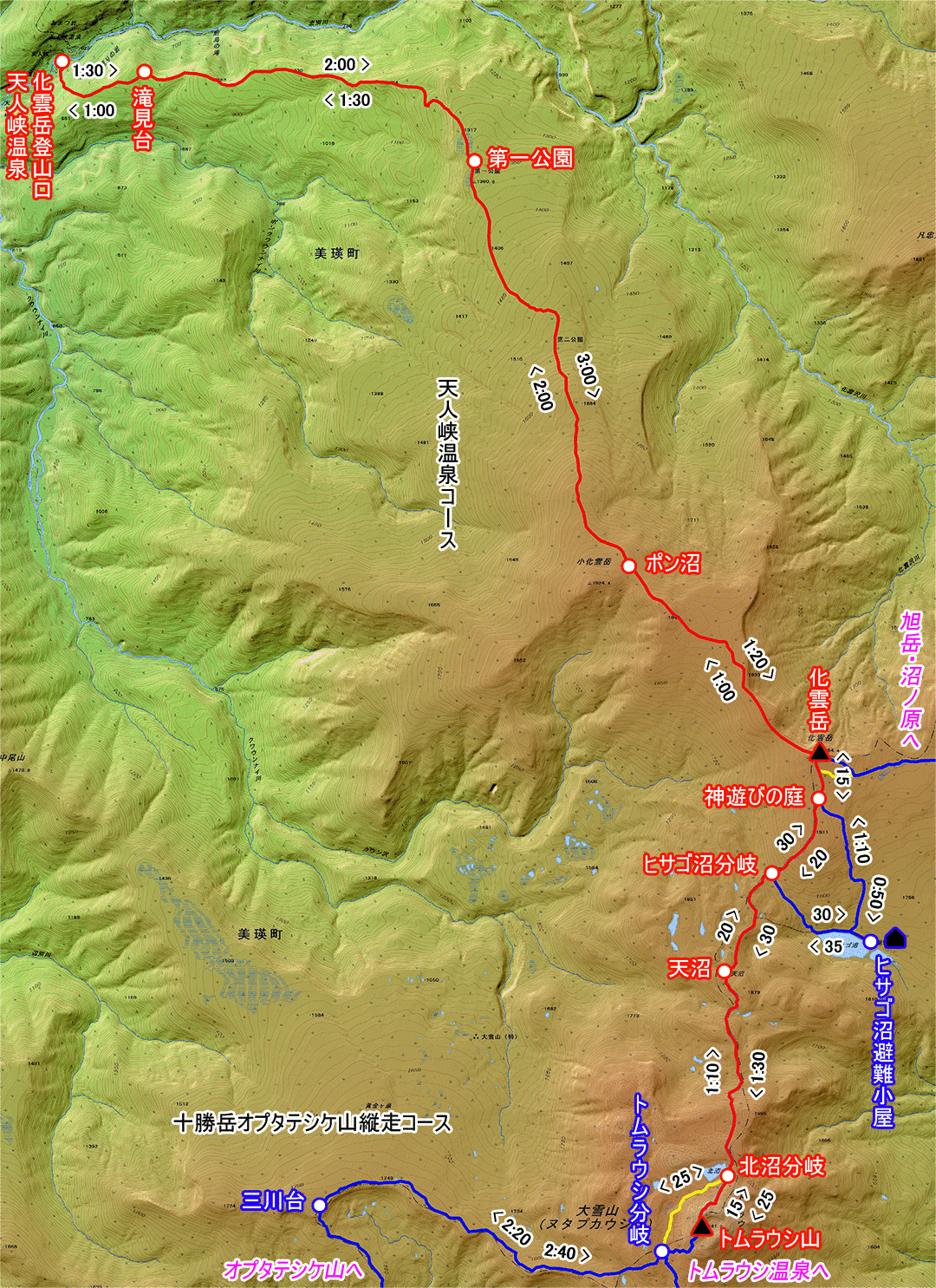 天人峡温泉・化雲岳登山口 → 滝見台 → 第一公園 → ポン沼 → 化雲岳 → 神遊びの庭 → ヒサゴ沼分岐 → 天沼 → 北沼分岐 → トムラウシ山 → トムラウシ分岐 → 前トム平 → コマドリ沢出合 → カムイ天上 → 温泉コース分岐 → トムラウシ温泉・国民宿舎東大雪荘
