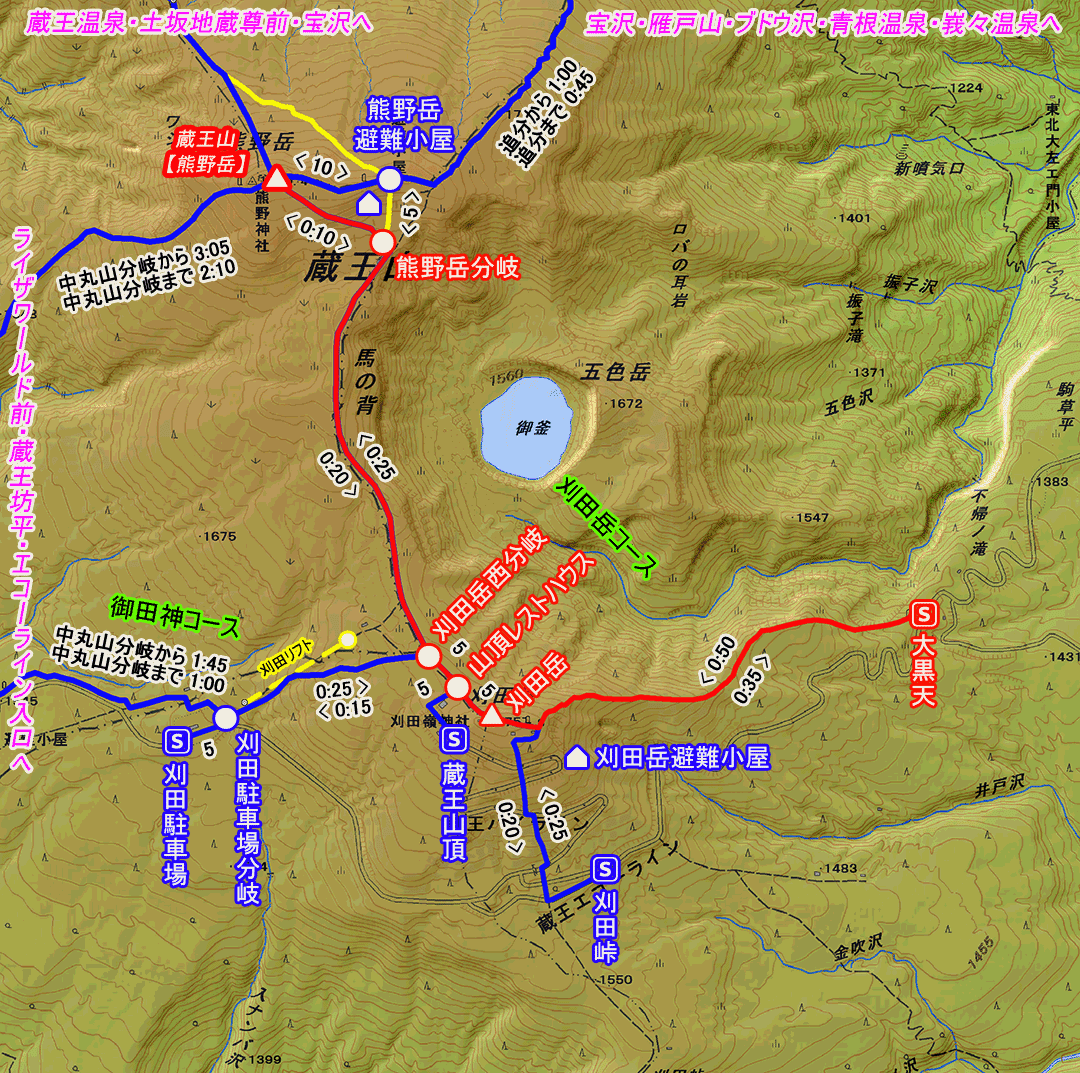 大黒天 → 刈田岳 → 山頂レストハウス → 刈田岳西分岐 → 熊野岳分岐 → 蔵王山【熊野岳】 → ワサ小屋跡 → 御田神様 → 観松平(東) → 観松平(西) → 樹氷高原駅 ━ 蔵王ロープウェイ(蔵王山麓駅)