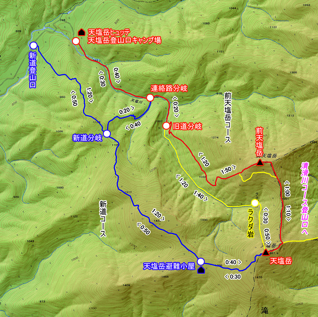 天塩岳ヒュッテ・天塩岳登山口キャンプ場 → 連絡路分岐 → 旧道分岐 → 前天塩岳 → 天塩岳 → 天塩岳避難小屋 → 新道分岐 → 連絡路分岐 → 天塩岳ヒュッテ・天塩岳登山口キャンプ場