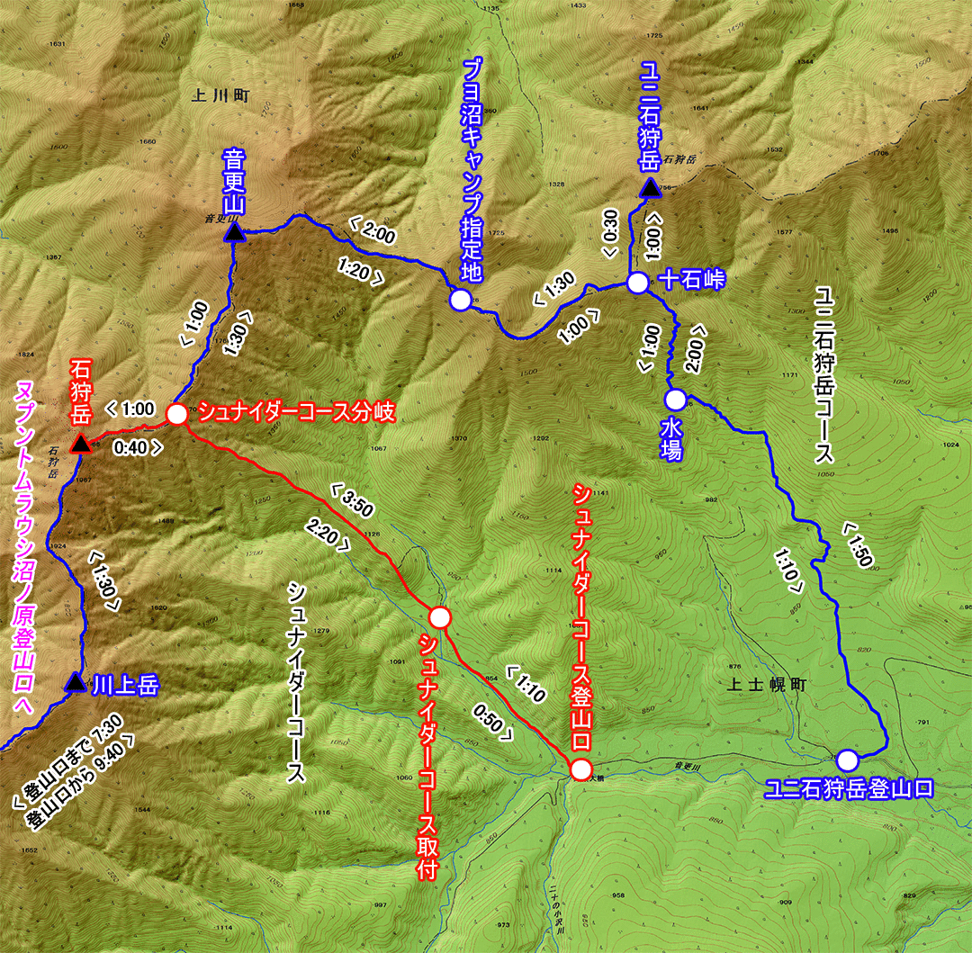 シュナイダーコース登山口 → シュナイダーコース取付 → シュナイダーコース分岐 → 石狩岳 → シュナイダーコース分岐 → 音更山 → ブヨ沼キャンプ指定地 → 十石峠 → ユニ石狩岳 → 十石峠 → 水場 → ユニ石狩岳登山口